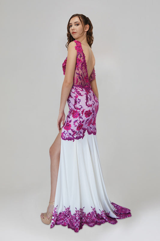 FANTASIA | Magenta Embroidered Lace Illusion Bodice Formal Dress
