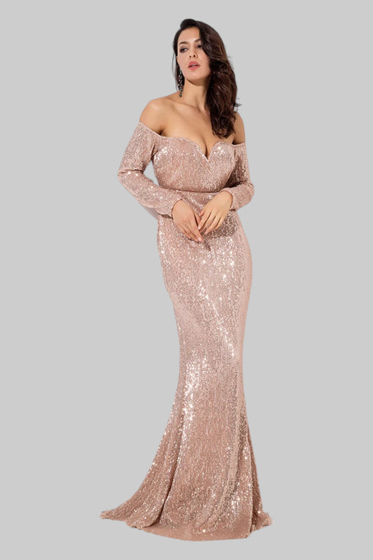 ATASI | Off Shoulder Rose Gold Sequin Formal Dress