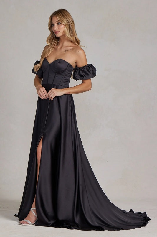 BRYLEE | Puff Sleeve A Line Satin Black Wedding Dress
