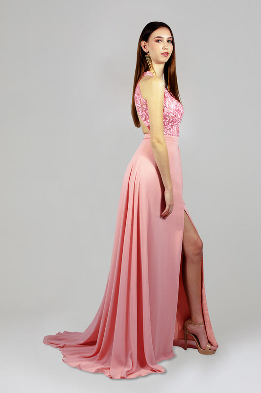ARELLA | Lace Bodice Chiffon Pink Formal Dress
