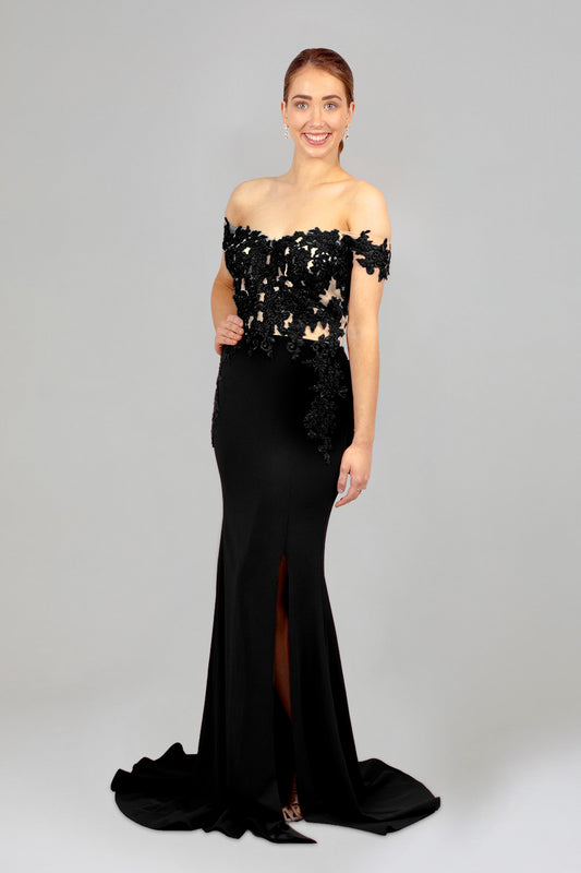 MYSTIQUE | Off Shoulder Lace Bodice Black Formal Gown