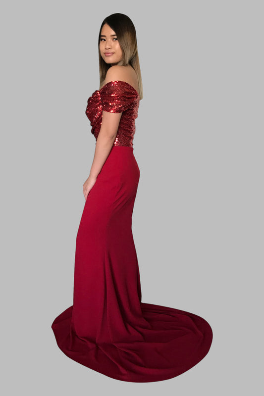 AMORA | Off Shoulder Red Sequin Bodice Formal Dress
