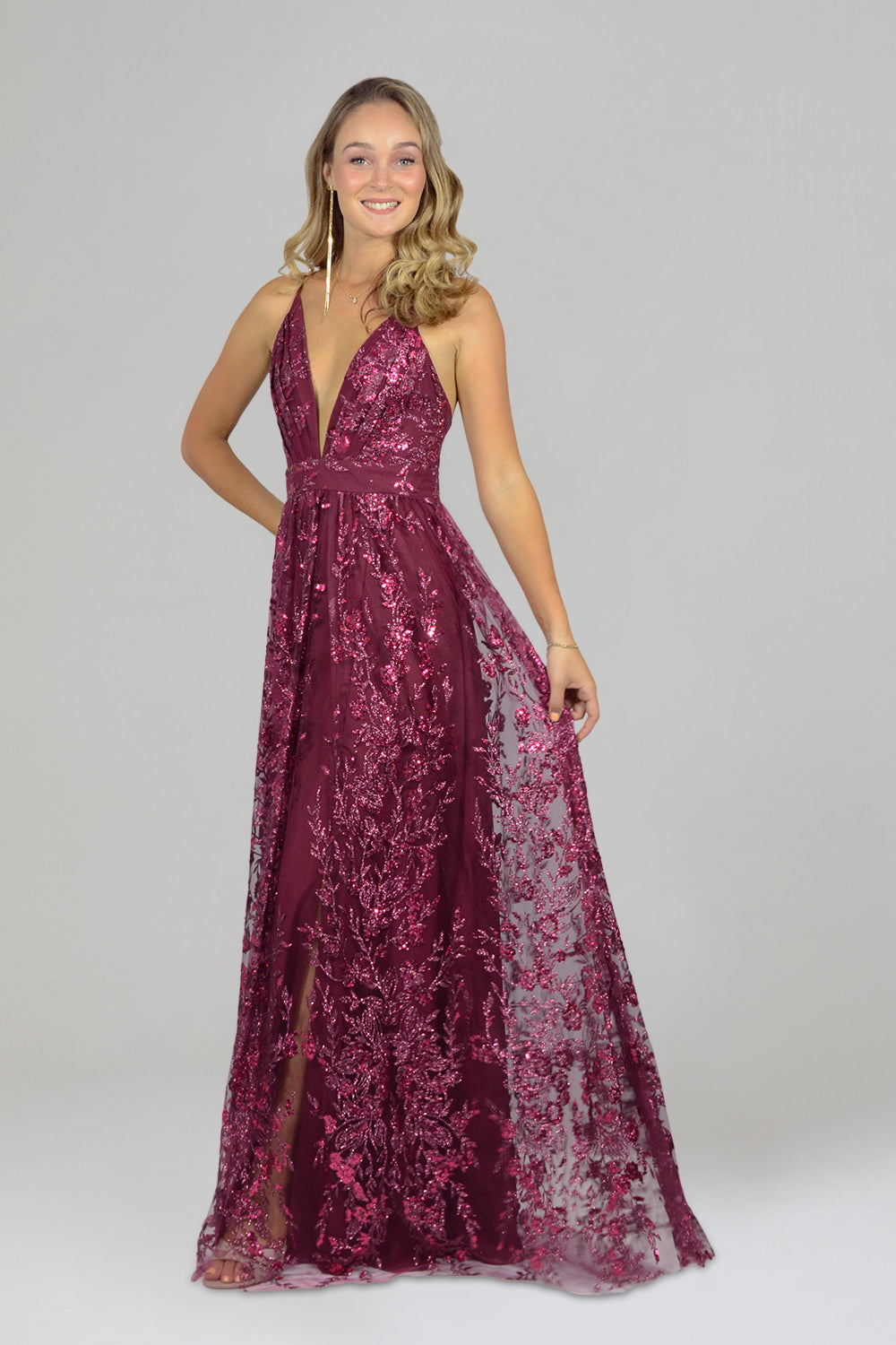 The dress is a perfect mix of simplicity in a fuss free flowy A line style silhouette that is amped up with plunge neckline and glistening floral patterned sequin and glitter fabric.
