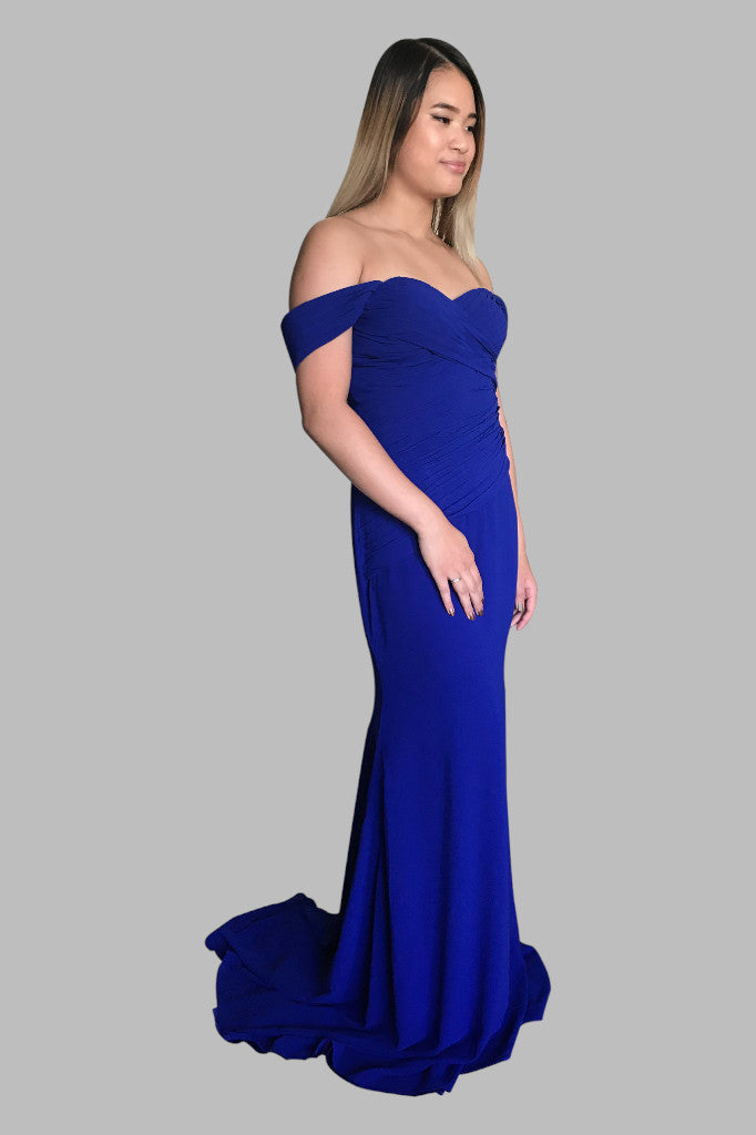 Indulge in timeless elegance with the LUCINDA royal blue off-the-shoulder formal dress, a dress designed to mesmerize and radiate sophistication at your special event.