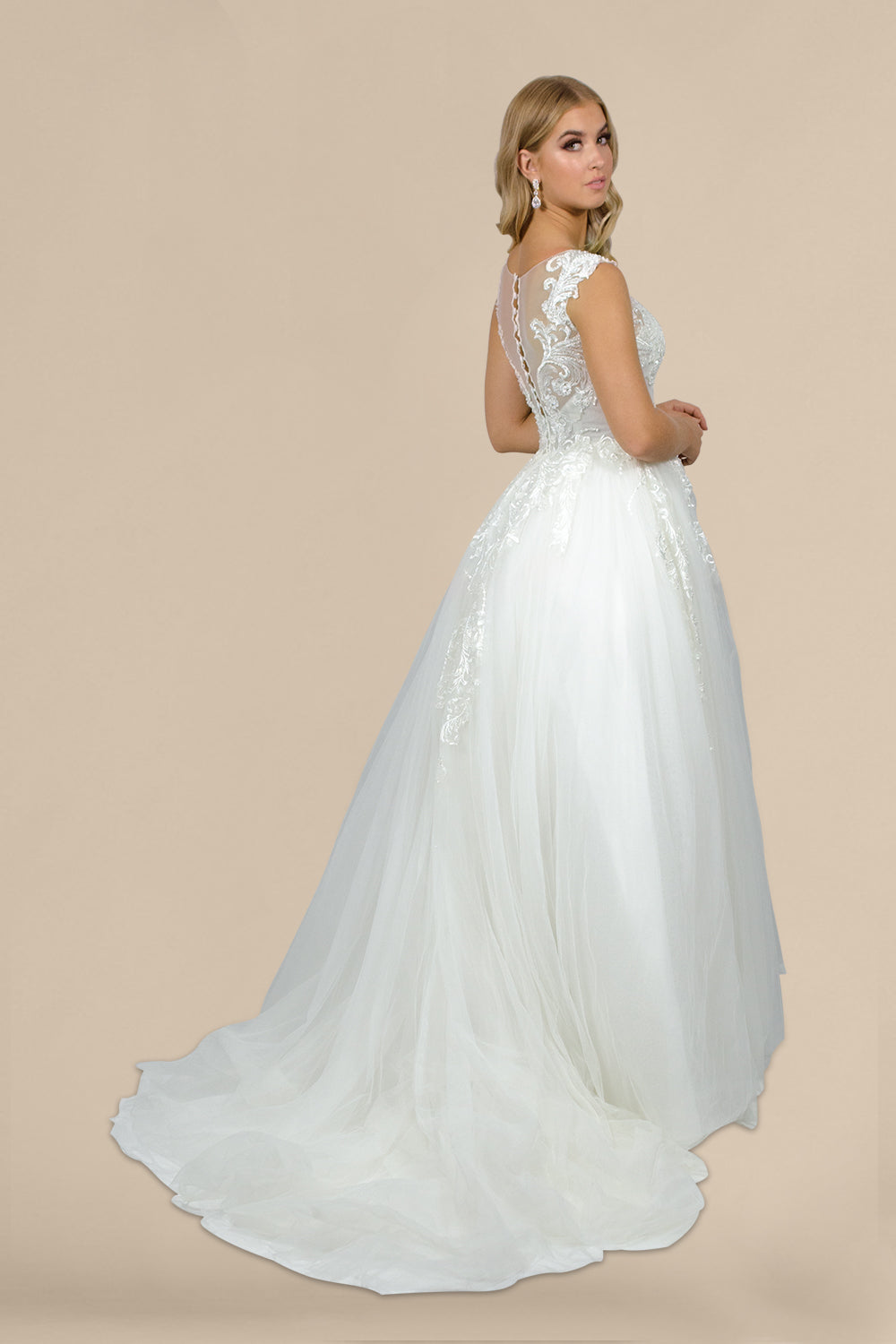 The lace applique extends from the bodice down to the A line skirt, creating a stunning effect and timelessly beautiful look. The back features an illusion style look with pearl button up closure.