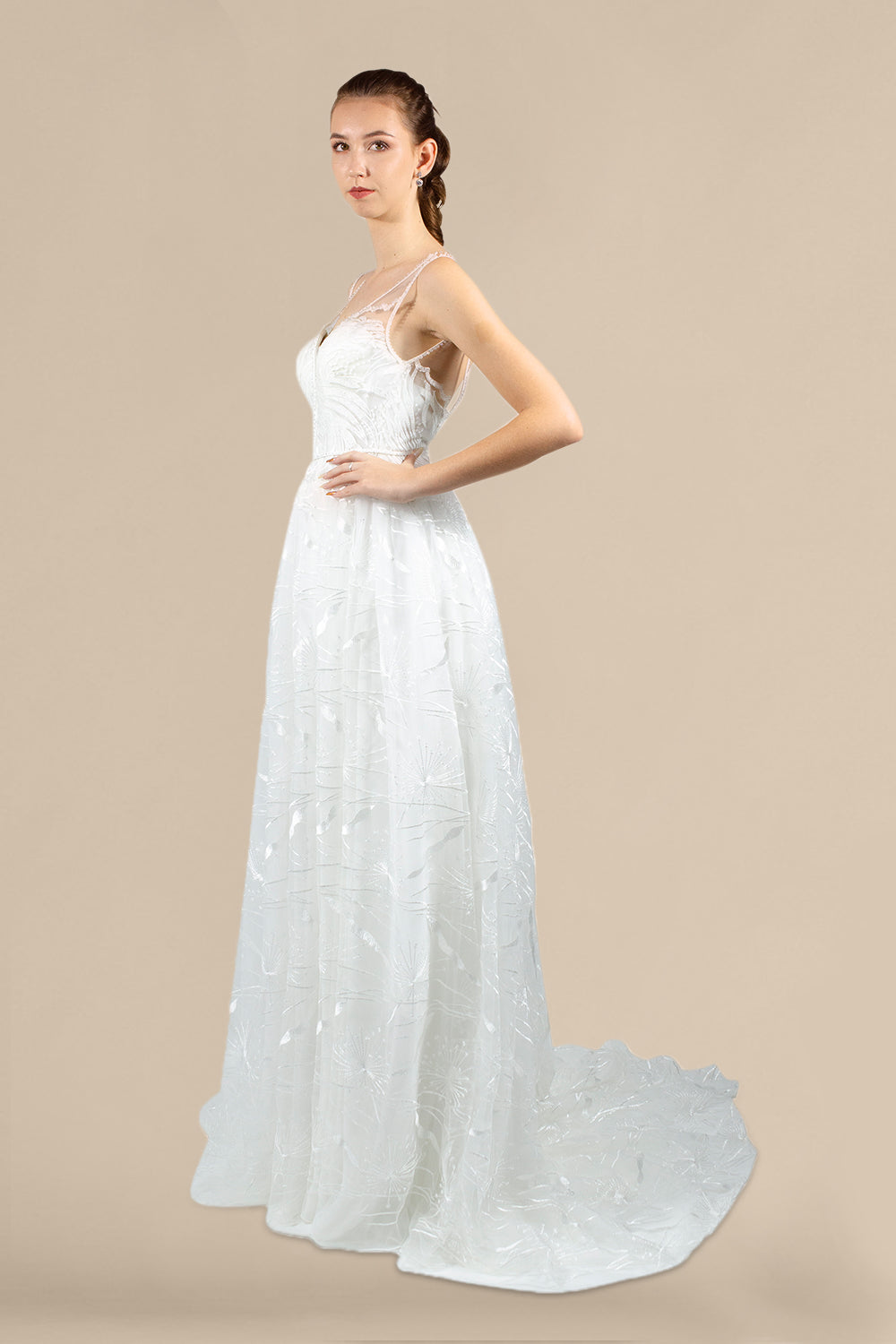 Whether you prefer a relaxed A-line silhouette or a more defined A-line ball gown look, this dress adapts effortlessly to your style. Ideal for alfresco or garden receptions, it adds a touch of chicness while seamlessly blending with your outdoor theme, making your special day truly unforgettable.